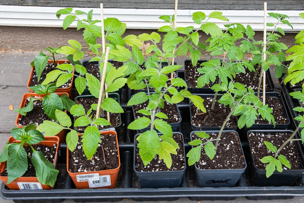 Tomatoes “hardening off” outside in pots before being planted in the garden.